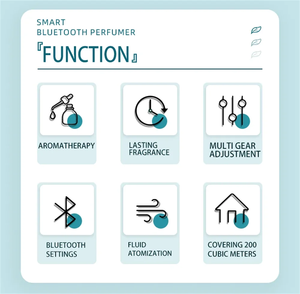 • Bluetooth APP control for schedule, intensity, and scent duration